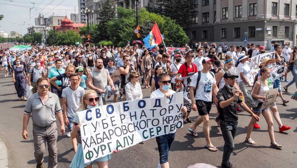 منذ 3 أسابيع لم تهدأ التظاهرات الشعبية في أقصى الشرق الروسي في مقاطعة خاباروفسك، وفي مدن أخرى كبيرة مثل فلاديفوستوك وكومسمولسك نا امور وبيرم وغيرها، إذ شارك في خاباروفسك وحدها ما يقارب 50 ألف متظاهر (عدد سكان خاباروفسك 700 ألف إنسان)، ويقول خبير روسي: لو كانت هذه التظاهرات في موسكو بالنسبة نفسها لوصل عدد المتظاهرين إلى 700 ألف شخص على أقل تقدير. أي إن عدد المتظاهرين كبير جدًا، لدرجة لم يسبق لها مثيل في روسيا. وقد اعتُقل عشرات الناشطين، ولكن أقل الاعتقالات كانت في خاباروفسك، وقد يعود ذلك لحذر السلطة من استفزاز المواطنين المتحمسين جدًا للمحافظ المعتقل، وقد أطلقوا شعارات “أنا ونحن – سيرغي فورغال”، علمًا أن التظاهرات غير مرخصة، ونشرت السلطات الأمنية أوراقًا كُتب عليها أن التظاهرات غير مرخصة وسوف يتعرض المتظاهرون للعقوبات الإدارية والجنائية. وكذلك نشرت أوراقًا تقول إن السلطات تنصح المواطنين بعدم التظاهر، خوفًا من فيروس كورونا. وتسربت في وسائل التواصل الاجتماعي أخبار تؤكد أن قوات الحرس الوطني تمركزت في مؤسسات الحكومة في المدينة، وكانت قد حضرت ليلًا إلى المدينة.