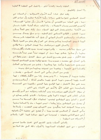 لســنا الآن في صدد البحث عن واقع الأحـزاب السياسية في وطننا العربي وعن مدى تجسيدها لإرادة الثورة والتغـيير لدى الجماهير العربية ولا في صدد البحث في نظرية الحزب الثوري الواحد أو الأحزاب المتعددة، أو جبهات الأحزاب، ولا الحزب الذي يمثل طبقة أو تحالفاً طبقياً، وإنما نحن بصدد حقيقة لا بــد من إقرارهـا قبل كل شيء آخــر، وهـي، أن الاتحــاد الاشــتراكــي في الإقـــليم الســـوري حــزب سياسي بكل ما في كلمة الحـزب السـياسي من معنى.. إنه حــزب ثوري حسـب المفهــوم العلمـي للحـزب، أو أنــه مصمم علـى أن يكون ذلك الحزب ذو الأهداف الواضحة والاستراتيجية البينة، والذي يجسد بحــق إرادة الجماهــير الكــادحــة، ويمثــل طلائعهــا الواعيـة المنظمـة الــتي تقــود نضالهــا.