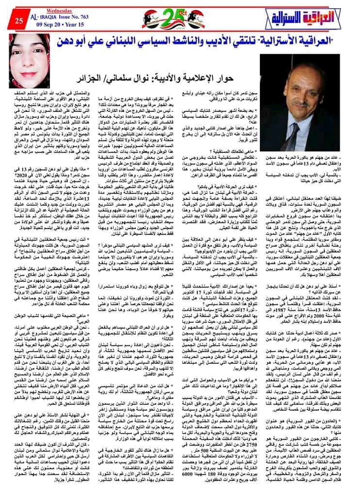 في حوار مع جريدة العراقية الأسترالية؛ الأديب والناشط السياسي اللبناني «علي أبو دهن»: