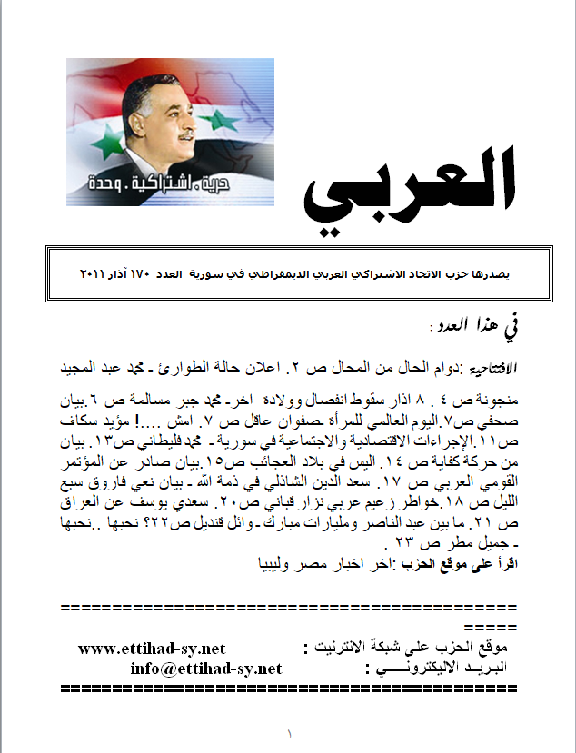 (1) المقال كُتبَ وحُرر لجريدة العربي الناطقة باسم حزب الاتحاد الاشتراكي العربي الديمقراطي في سورية في شهر شباط 2011، ونشر بالعدد 170 آذار 2011