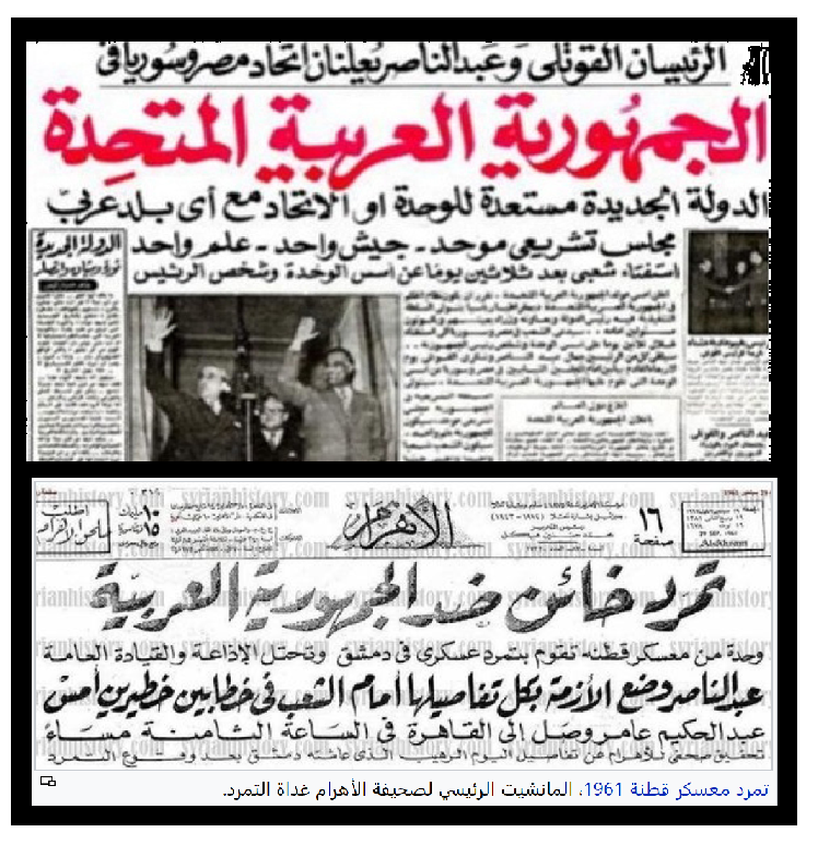 في صبيحة يـوم 28 أيلول / سبتمبر عـام 1961، قـام مجموعة من ضباط الجيش في سوريـة بانقـلاب عسكري في دمشق التي كانت حينهـا الإقليم الشمالي من الجمهورية العربية المتحدة، فصم الانقـلاب عــرى الوحـدة المصرية- السورية التي اتفق على إقامتها في 1 شباط / فبراير 1958 بين الإقليمين، وجرى استفتاء شعبي عليها كان منطوقه يقول: ’’هل توافق على إقامة الوحدة بين سورية ومصر وعلى جمال عبد الناصر رئيساً للجمهورية‘‘. جاء الاستفتاء بالموافقة بأغلبية ساحقة وذلك في 22 شباط / فبراير 1958، وبذلك أصبحت أول وحدة عربية بين قطرين في العصر الحديث، بعد زمن طويل من الاحتلالات والانقسامات. لذلك كانت وحدة رائدة بكل المقاييس، كونها تتم بين قطرين رئيسيين كان توحدهما دائماً في صالح الأمة، فتوَحدهما قضى على غزوات المغول في معركة عين جالوت، وحرر القدس من الغزو الصليبي على يد القائد صلاح الدين الأيوبي، وهذه الوحدة الجديدة أبعدت الخطر التركي الداهم الذي شكل حلف بغداد ركيزته الرئيسية بحجة الخطر الشيوعي المهدد لسورية، وكانت رغبة الحلف ألذي تألف من بريطانيا وإيران وتركيا وباكستان والعراق ومعهم أميركا، أن يضم سورية حسب مشروع الرئيس الأمريكي أيزنهاور لمليء الفراغ في المنطقة، والمقصود هنا حزاماُ أمنياُ مطوِقاً للاتحاد السوفييتي في ذروة الحرب الباردة بين القطبين العالميين الأكبر. رفضت سورية ببرلمانها المنتخب الانضمام للحلف مما عرضها لضغوط سياسية وعسكرية واقتصادية. جاءت الوحدة بين القطرين لتزيل تلك التحديات بانضمام سورية إلى مصر المنتصرة في معركتي الجلاء وتأميم قناة السويس ولتتشكل دولة قوية في المشرق العربي وصفها أحد قادة العدو الصهيوني بأنه من المزعج أن تنام وبجوارك دولة تعدادها أربع ملايين وتصحو في اليوم التالي لتجد هذه الدولة أصبحت ثلاثين مليوناً.