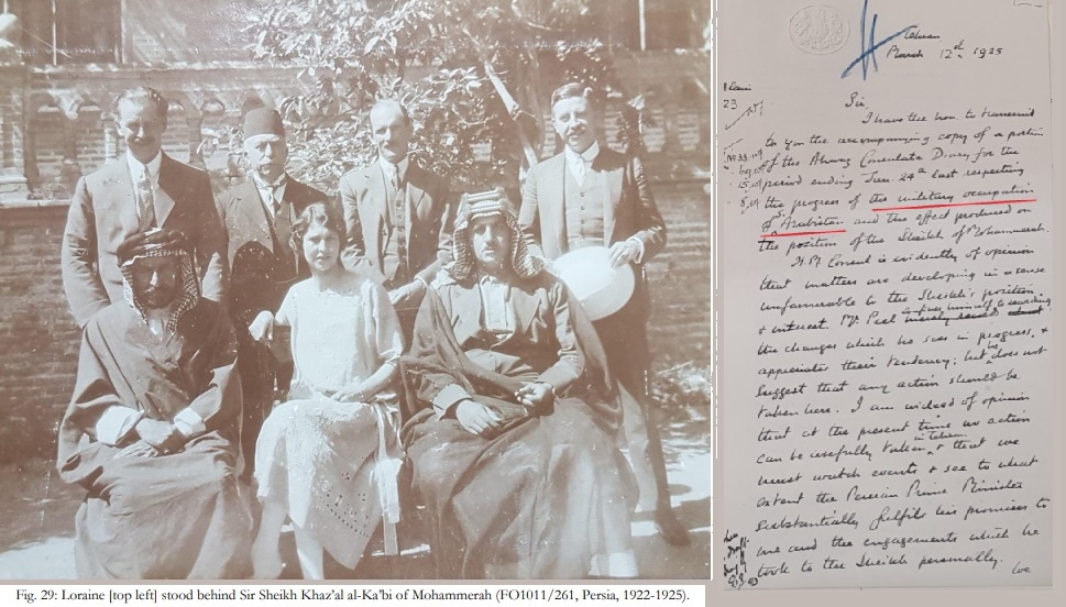 يسعدني أحيل إليكم نسخة مرفقة من يوميات القنصلية (البريطانية) في الأحواز للفترة المنتهية في 24 كانون الثاني (يناير) 1925، عن آخر المستجدات حول تقدم الاحتلال العسكري لـ عربستان وتأثير ذلك على سيادة شيخ المحمرة، (لشيخ خزعل بن جابر).