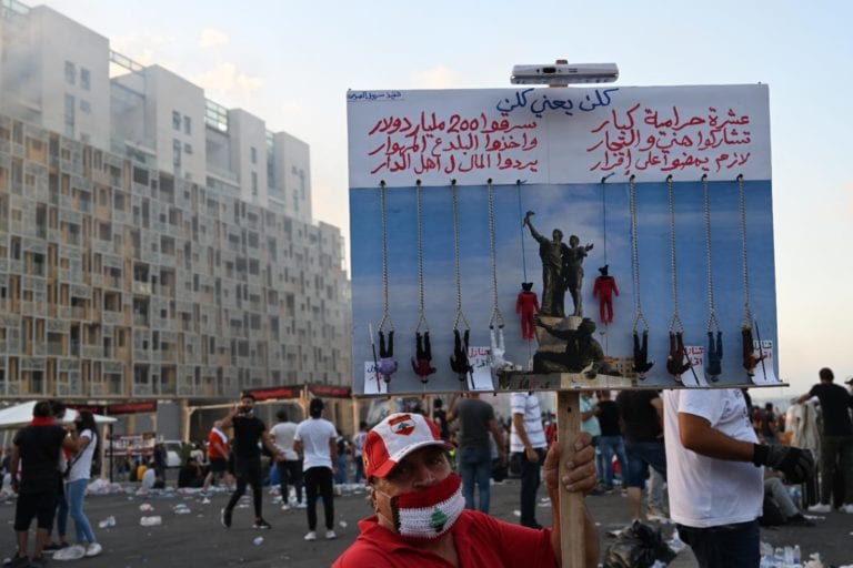 هو أيضاً يوم المشانق بحسب ما أطلق عليه المتظاهرون الذين نصبوا حبالاً معلق عليها صور الزعماء السياسين في دعوة لمحاسبتهم على ما ارتكبوه.