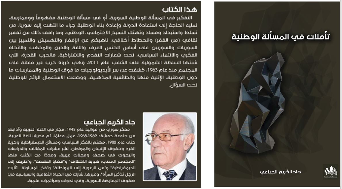 (130). راجع/ي، جاد الكريم الجباعي، من الرعوية إلى المواطنة، يصدر قريبًا عن دار أطلس، دمشق وبيروت.