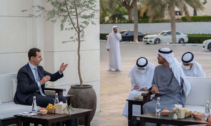 كان من المستحيل ألا تفضي تصرفات حكام الإمارات، بدءا من تلك الحادثة أعلاه، قبل نحو عشر سنوات، مرورا بإعادة فتح سفارتهم في دمشق، أواخر عام 2018، وصولا إلى التصريحات المعسولة لسفير الإمارات لدى النظام، بعدها بعام، بحضور فيصل المقداد: “أتمنى من الله أن يسود الأمن والأمان والاستقرار ربوع الجمهورية العربية السورية، تحت ظل القيادة الحكيمة لفخامة الرئيس الدكتور بشار الأسد” وكذلك جيش المحللين السياسيين الإماراتيين الذين أوكلت إليهم مهمة تبييض الدور الإماراتي الملتبس وغير النظيف، في قيادة الثورات المضادة وإعادة تدويرها لنظام الأسد، وإظهاره على أنه “براغماتية تستوجبها الظروف الراهنة”، كان من المستحيل ألا تفضي لعبة الدومينو المفضوحة تلك إلا إلى ما أفضت إليه وألا تُتوج بزيارة لبشار الكيميائي، رئيس النظام السوري، إلى الإمارات أو العكس.