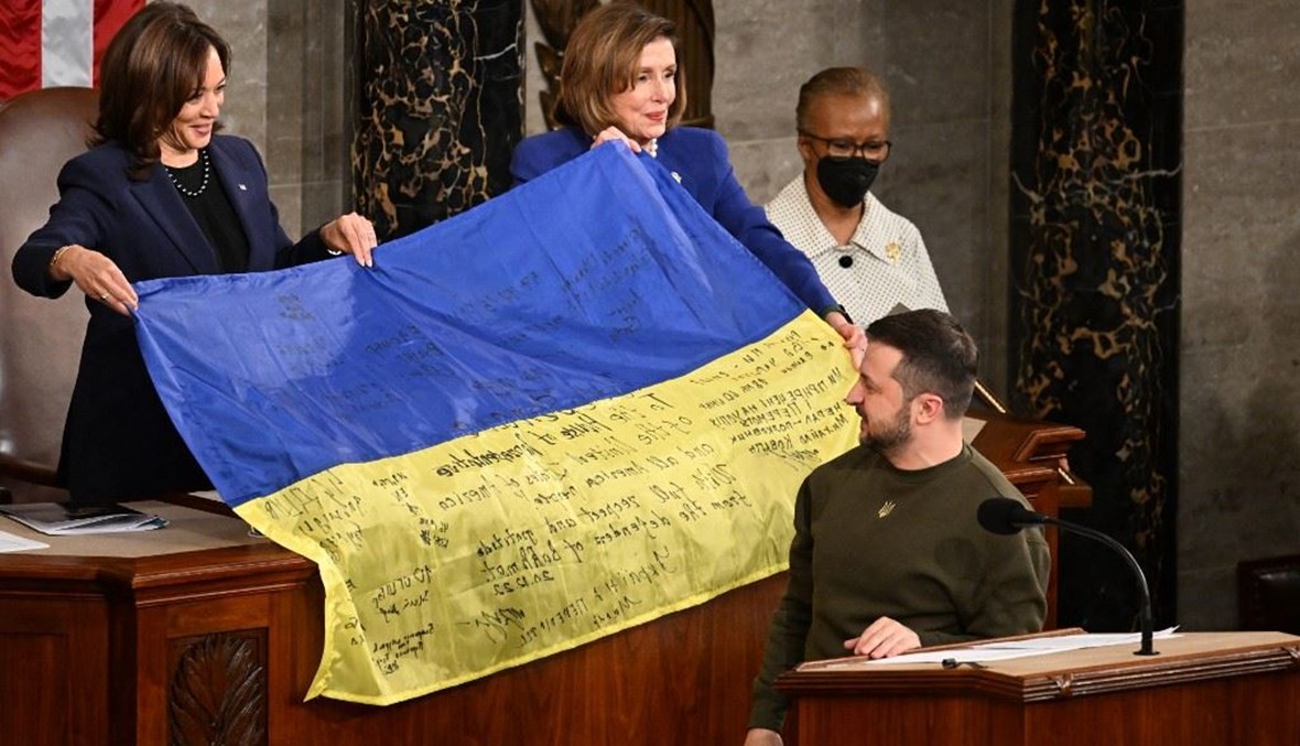 في وقت كان الرئيس فلاديمير بوتين ينتقد جيشه وقيادته بنبرة تكاد تقترب من التوبيخ على الفشل العسكري والوهن فيه، كان الرئيس الأوكراني فولوديمير زيلينسكي يقدّم الى الكونغرس الأميركي المنعقد للاستماع اليه عَلَماً ضخماً لأوكرانيا موقَّعاً عليه من جنود في ساحة الحرب مع روسيا، ثم ميدالية من جندي أوكراني الى الرئيس جو بايدن.