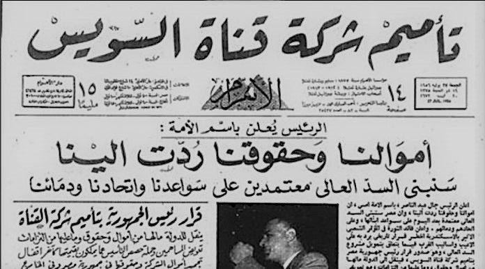 “تُؤمّم شركة قناة السويس شركة مساهمة مصرية”.. يُعدّ هذا القرار التاريخي للزعيم جمال عبد الناصر عام 1956، في أعقاب رفض البنك الدولي تمويل مشروع بناء السد العالي، مثالاً نموذجياً لصنع القرار من إعداد مسبق لكل الاحتمالات السياسية والعسكرية المنتظرة وقتها، وكان حدث التأميم ضربةً تاريخيةً في قلب الاستعمار البريطاني والفرنسي. وقد بُنيت القناة بعرق آلاف الفلاحين المصريين وتضحياتهم، وارتبطت استعادتها باسترداد القرار الوطني، بعد اصدار محمد سعيد باشا عام 1854 امتياز حفر القناة للدبلوماسي الفرنسي فرديناند ديلسيبس مدة 99 عاماً. وكانت القناة مدخلاً للسيطرة الأجنبية على الموارد المالية المصرية، بفعل الديون التي تسبّب فيها إسماعيل باشا، والي مصر فيما بعد.