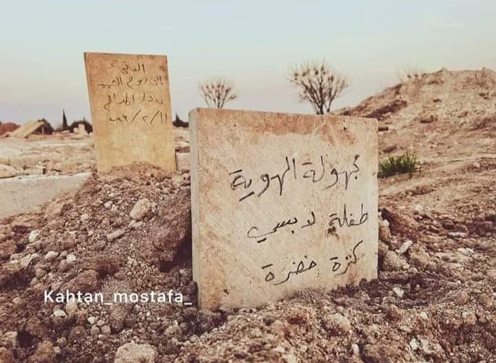 أحدهم يلملم ثياب أبنائه، وآخر يسحب من براثن الرُّكام ما بقي من ملابس أهله، وأخرى تملأ رئتيها بآخر رائحة للمغادر على جناح الموت، وتستمر المشاهد تترا، حتّى وصلت إلى الصّورة المرفقة، وأعتذر للعالم الرَّقيق الحساس المرهف على بشاعة اللَّقطة وقساوة الكلمات الَّتي حَمَلتها شاهدة من خشب كُتب عليها بلهجة محليّة: