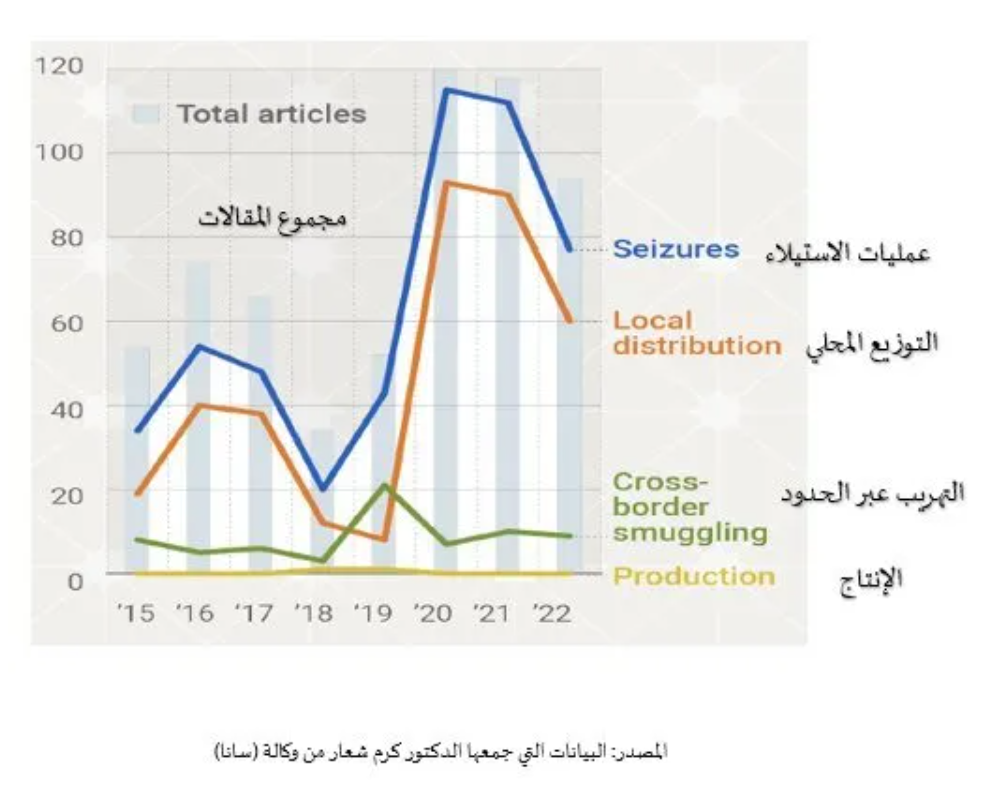 ويحلل هذا التقرير جميع المقالات التي تحمل كلمة “مخدرات narcotics”، في عنوانها في الموقع الرسمي للوكالة العربية السورية للأنباء (سانا) من الأعوام 2015 إلى 2022. وتستكمَل هذه البيانات بالتقارير الرسمية التي قدّمتها سورية إلى مكتب الأمم المتحدة المعنيّ بالمخدرات والجريمة، وببيانات مسؤولي النظام، وبأحكام الإعدام المتعلقة بالمخدرات والمعلنة في الجريدة الرسمية. لفحص السياسات على أرض الواقع، يحلل المؤلفون نوعيًا الأدبيات الموجودة، ويتتبعون إعلانات المضبوطات المبلَّغ عنها من بلدان أخرى في المنطقة، خلال عامي 2021 و2022، حيث حددت سلطة الاستيلاء رسميًا وصراحة بلد أو منطقة منشأ شحنات الكبتاغون.