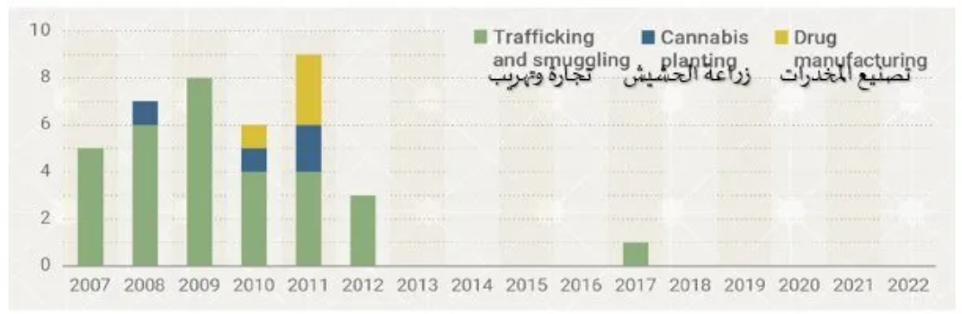 وقد تكرر هذا الرأي بأن سورية ليست سوى بلد عبور في الآونة الأخيرة. في أيلول/ سبتمبر 2022، صرّح مدير إدارة مكافحة المخدرات السورية، العميد نضال جريج، بأن حملة مكافحة المخدرات التي شنها النظام أدت إلى اعتقال تجار المخدرات ومصادرة كميات كبيرة، زاعمين أن الجزء الأكبر من هذه الاعتقالات وعمليات المنع كانت في “مناطق حدودية” أو “مخابئ سرية” كانت تمر عبر سورية، ولم تكن خارجة من البلاد. عندما كان الإنتاج على نطاق صناعي أقلّ انتشارًا في سورية، خلال عامي 2010 و2011، صدرت ثلاثة أحكام بالإعدام على جرائم تصنيع المخدرات. لكنّ تحوّل البلاد إلى مورّد للمخدرات يُثير قلقًا عالميًا، خاصة خلال الأعوام الأربعة الماضية، إذ لم تكن هناك أحكام تتعلق بإنتاج الكبتاغون على نطاق واسع أو صغير، باستثناء اعتقالات التجار والمهربين المحليين. وإضافة إلى ذلك، تشير البيانات إلى أن النظام لم يقم بأي عملية مداهمة لمخابر التصنيع، وهو ما يشير إلى أن قوات إنفاذ القانون تبقي على مسافة آمنة من مرافق الإنتاج المعروفة.