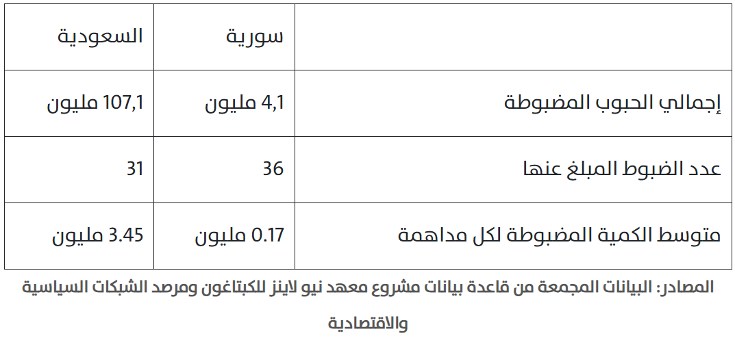 والثاني، كانت كميات الأقراص/ الحبوب المضبوطة في كل مداهمة أقل بكثير، مقارنة بما ضبِط في المنطقة، على الرغم من وجود مرافق (ورشات) إنتاج على نطاق صناعي في سورية. للتوضيح، في المملكة العربية السعودية، بلغ متوسط حجم شحنات الكبتاغون المضبوطة (3,45) مليون حبة، أي ما مجموعه (107) ملايين حبة، مع الإبلاغ عن (31) مداهمة على الأقل في عام 2022. أبلغت سورية عن (36) عملية مداهمة في المناطق الخاضعة لسيطرة النظام، بمتوسط (169,000) حبة لكل عملية ضبط أي (5) في المئة من عدد الحبوب المصادرة في المملكة العربية السعودية. يشير هذا إلى أن المضبوطات في سورية كانت أكثر شكلية بطبيعتها، ولا سيما أن دمشق تشعر بضغط أكبر لمكافحة إمدادات الكبتاغون، كبادرة حسن نية وسط محادثات التطبيع.
