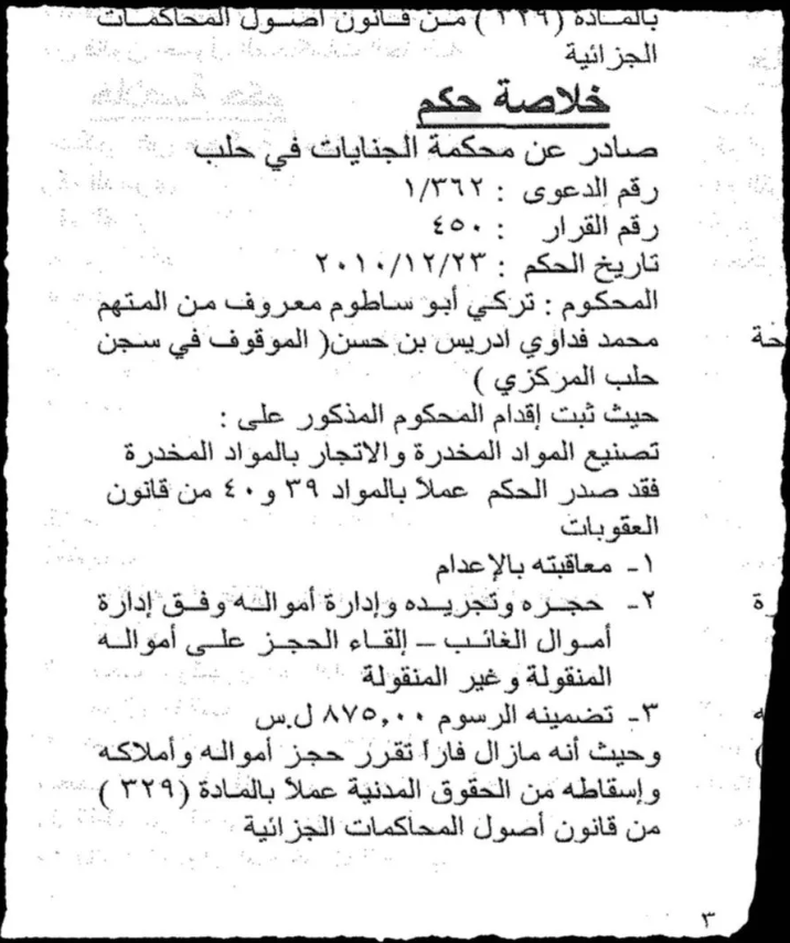 من الأمثلة على أحكام الإعدام التي أعلِنت في الجريدة السورية في عام 2010 أن الرجل المدان حكم عليه بالإعدام بتهمة إنتاج المخدرات والاتجار بها: