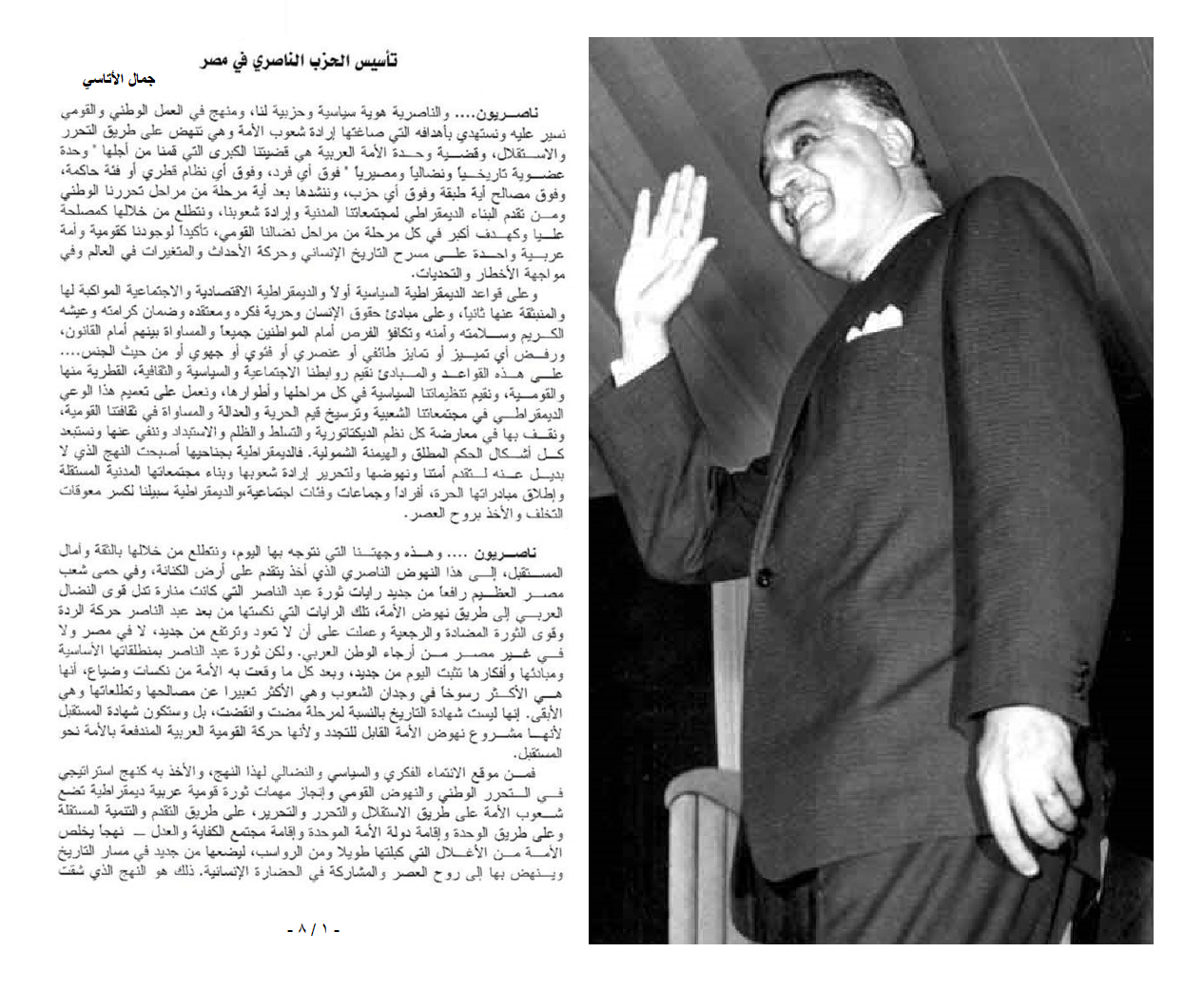 وبمثل هذا التطلع والأمل فإن الناصريين الصادقين في أرجاء الوطن العربي جميعهم، وكل المؤمنين بالقوميـة العربيـة، بل وكل المتطلعين إلى نهـوض تحـرري جديـد للأمـة والمناضلين في سبيل تقدمها ووحدتها.. وقفوا يحيون قيام الحزب الناصري في مصر بعد انتصاره في معركة الديمقراطية وانتزاعه حقه المشروع في الوجود العلني والمنظم، كحزب وطني معارض، يتأسس من جديد بالديمقراطية وتعبيراً عن مصالح الشعب ومطالب قوی الشعب العامل، ليعيد تأسيس السياسة في المجتمع في نهجٍ ناصري متقدم، ويعمل من أجل وحدة الأمة العربية …