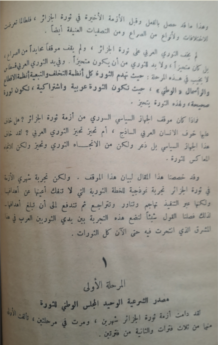 أما المرحلة الأولى فيمكننا أن نعطيها هذا العنوان «مصدر الشرعية الوحيد المجلس الوطني للثورة»، لأن الصراع بين الحكومة المؤقتة للجمهورية الجزائرية التي يرأسها بن يوسف بن خدة وبين المكتب السياسي الذي يرأسه أحمد بن بلة كان يدور رسمياً حول «أيهما السلطة الشرعية، الحكومة المؤقتة أم المكتب السياسي؟ وما هي المنظمة التي تضفي أو تنزع صفة الشرعية هذه؟».