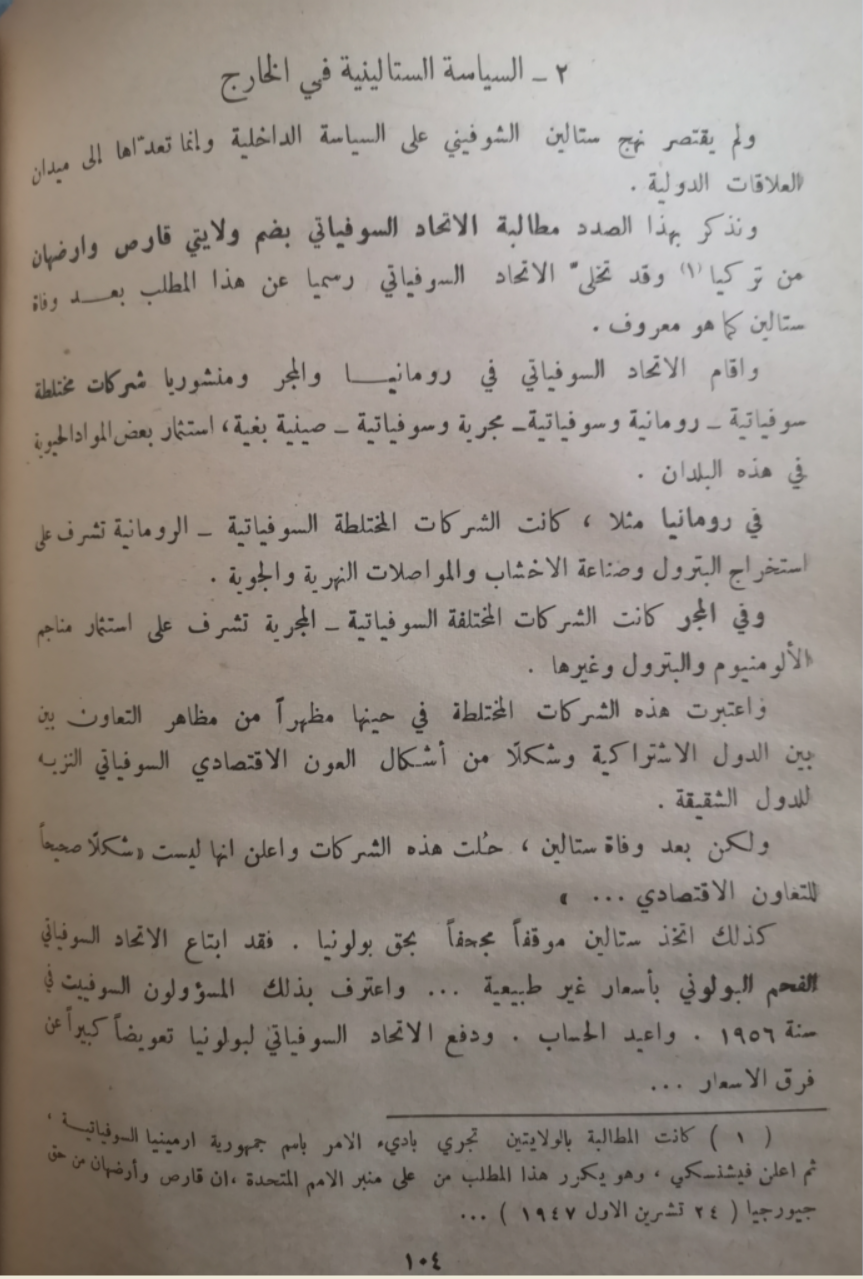 ونذكر بهذا الصدد مطالبة الاتحاد السوفياتي بضم ولايتي قارص وأرضهان من تركيا(11) وقد تخلىّ الاتحاد السوفياتي رسمياً عن هذا المطلب بعد وفاة ستالين كما هو معروف.