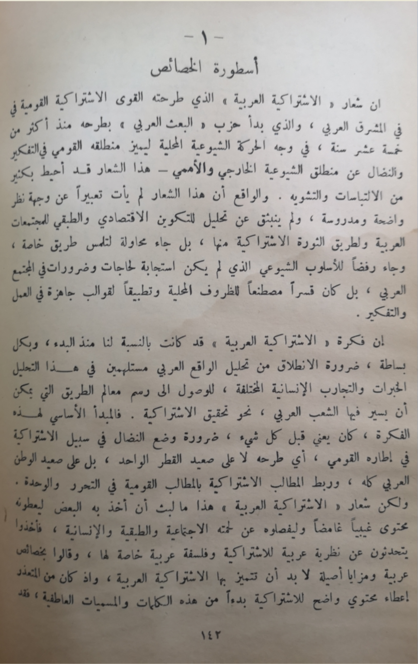 ولكن- وفي هذا السبيل- لا بد من الانعتاق من التفكير السلبي ومن ردود الفعل العاطفية، ولا بد من التحرر من أسطورة الخصائص الثابتة والمزايا الخالدة للاشتراكية العربية.