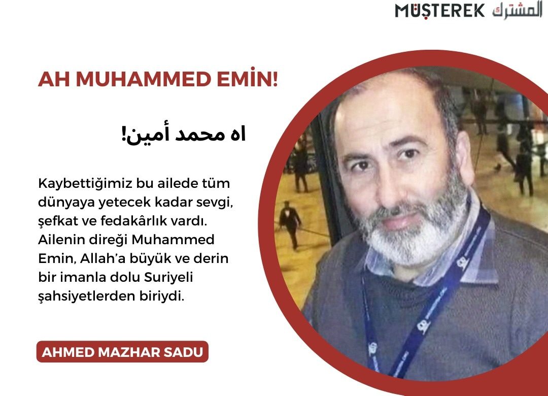 لم تغب عني يا حبيب الروح ورفيقها ولا لحظة واحدة، كان الفؤاد والمخيال يرفرف في ذكراك ومع كل نبرة ذكرى من صوتك وحركتك الدؤوبة على طول المدى، لم يبرح محياك المكان، ولا الزمان أبدًا. وبقيت يا أخي وصديقي ومهجة قلبي (محمد أمين) جوانية نفسي وروحي لم تفارقها يومًا ولا يمكن ذلك كما يبدو مطلقًا، أتذكرك كما الذين رحلوا معك صباح ذلك اليوم اللعين والكارثي، إلى رضوان الله ورحمته، من أسرتك جميعًا. أكتب ودمع العين ينهمر بحرقة وغزارة، وكيف لا يكون ذلك، وأنت في البال أبدًا، وأنت من أنت بما حملته من قيم وأخلاق وإخلاص ومحبة، ورغم قسوة الحياة، وبالرغم من التهجير القسري الذي طالك كما طال الشعب السوري الذي وقف في وجه الجلاد، وأراد الحرية والكرامة لوطنه وناسه ولنفسه، فتم قتله وتهجيره القسري إلى بلاد الله الواسعة.
