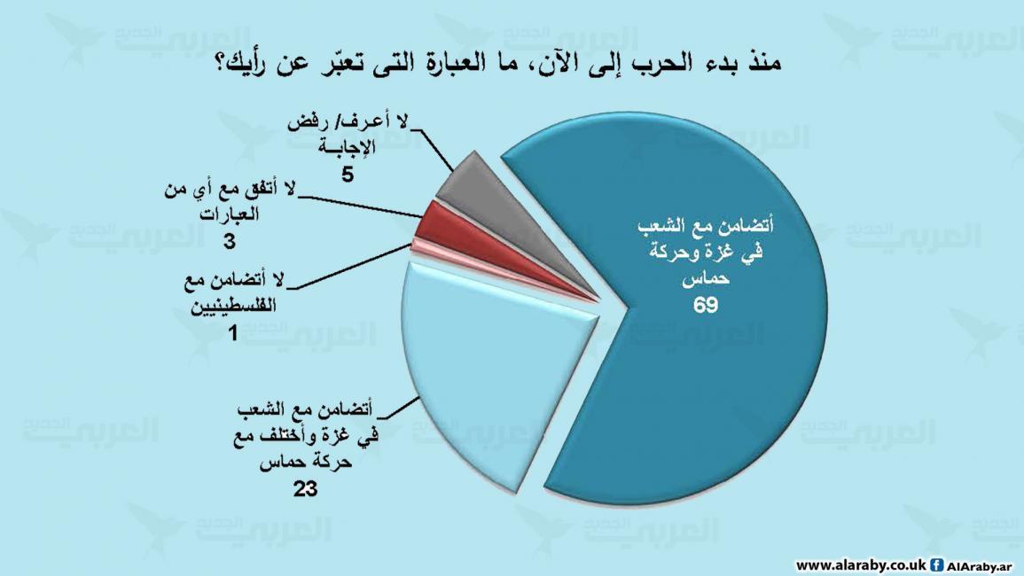 أبرز النتائج والدلالات التي يمكن الخروج بها من الاستطلاع، وترتبط بتحوّلات مهمّة ونوعية في اتجاهات الشارع العربي: المسألة الأولى، عودة الزخم الشعبي والوجداني والرمزي والسياسي للقضية الفلسطينية، والتأكيد من الجميع (بما يصل إلى 92% من العينة)، وهو التحوّل المهم في موقف الشارع في دول مثل السعودية والمغرب ومصر، إذ تظهر الأرقام تغيّرات مهمة عن السنوات السابقة، ولم يُخف 97% من المستجيبين أنّهم يشعرون بضغط نفسي نتيجة الحرب على غزّة.