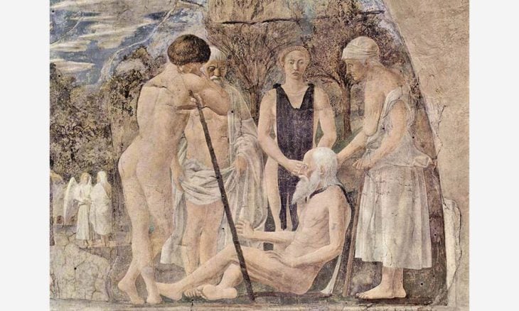 يصور لنا المحدث ومهندس الأبعاد الفنية التوسكاني بيارو ديلاّ فرانشيسكا الملامح الرسولية والحالة القيمية لمصير الإنسانية في جدارية سردية مضيئة على منوال الأعمال المعروفة في الفترة الدينيّة، يظهر فيها البياض طاغيا كلون متفائل يفتح آفاق المسيرة ويطبع الغياهب البعيدة بالأمل والحياة، مع تأطير علوي بخلفيات قوطية لأقواس محدبة بزركشة ذات تأثير شرقي، تذكرنا بالمكان وبالمراجع المشرقية للرسل والخلق والبعث، وإعادة الخلق بعنوان «موت آدم».