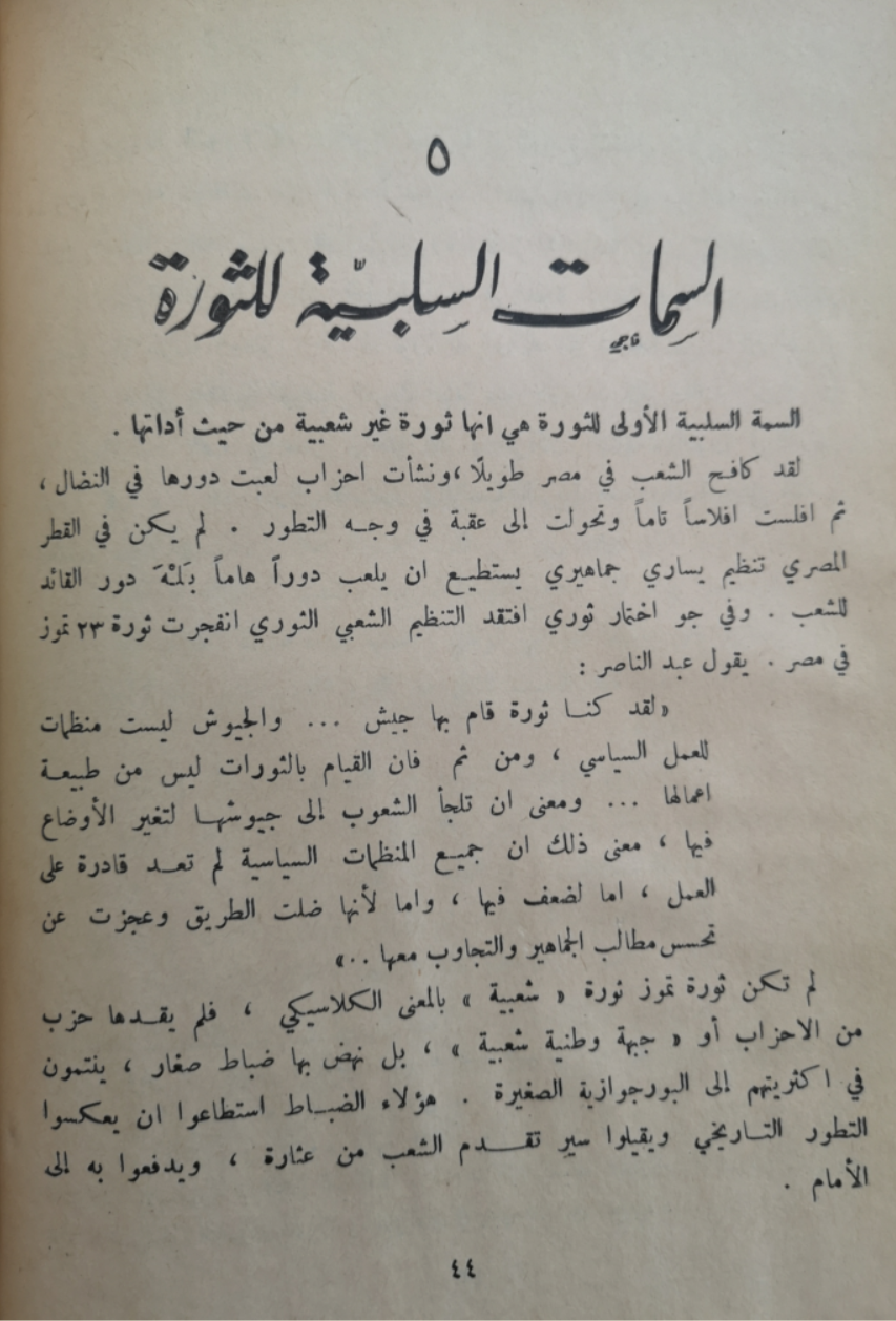 في وجـه التطور. لم يكن في القطر المصري تنظيم يساري جماهيري يستطيع أن يلعب دوراً هاماً بَلهْ دور القائد للشعب. وفي جو اختمار ثوري افتقد التنظيم الشعبي الثوري، انفجرت ثورة ٢٣ تموز/ يوليو في مصر. يقول عبد الناصر: