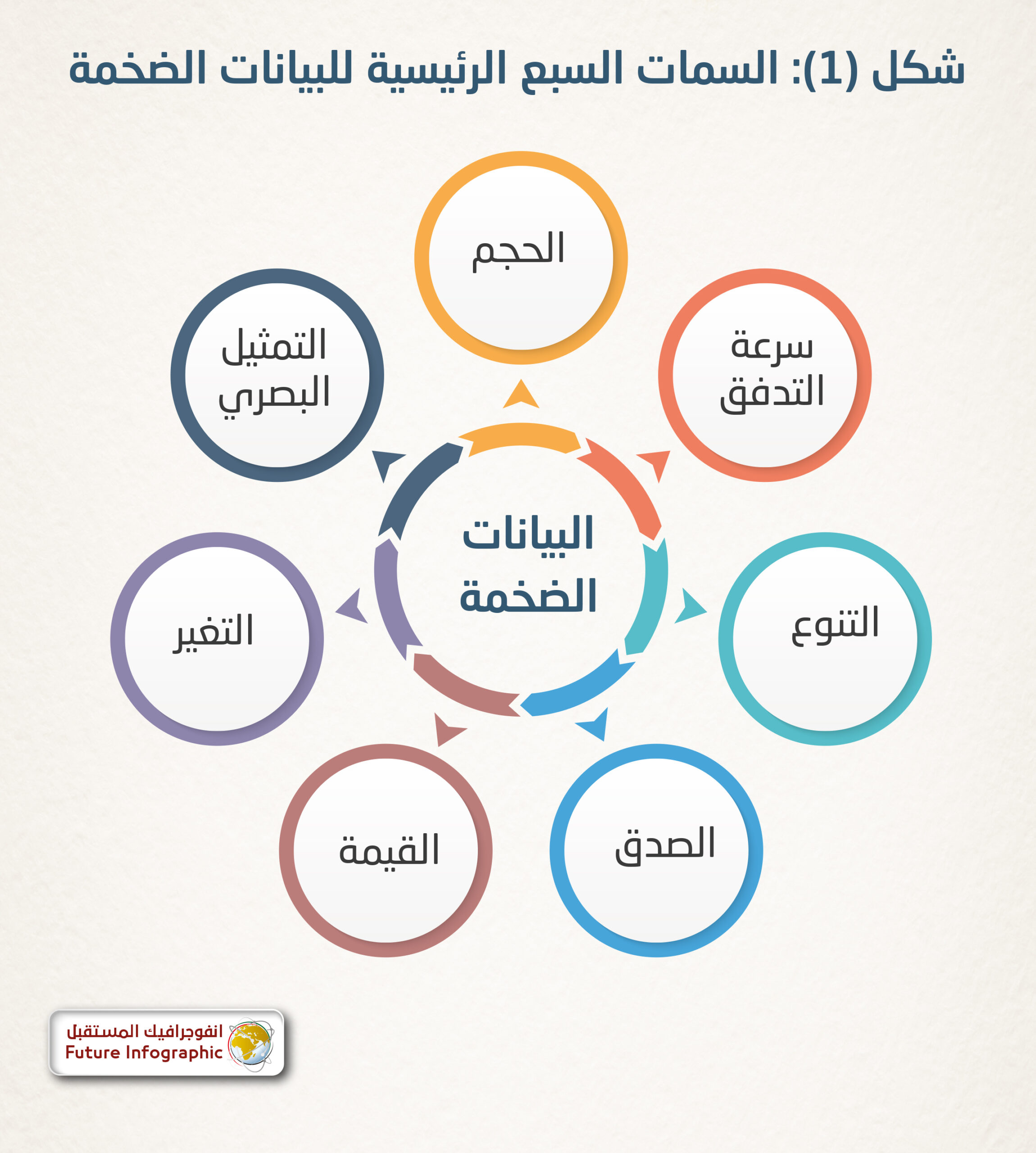 أما الحجم فهو أحد خصائص البيانات الضخمة لكنه ليس السمة الوحيدة؛ إذ هناك ما يعرف بـ The 7 V’s of Big Data وهي السمات السبع للبيانات الضخمة، وهي: الحجم (Volume)، سرعة التدفق (Velocity)، التنوع (Variety)، الصدق (Veracity)، القيمة (Value)، التغير (Variability)، التمثيل البصري (Visualization). كما هو موضح في الشكل التالي: