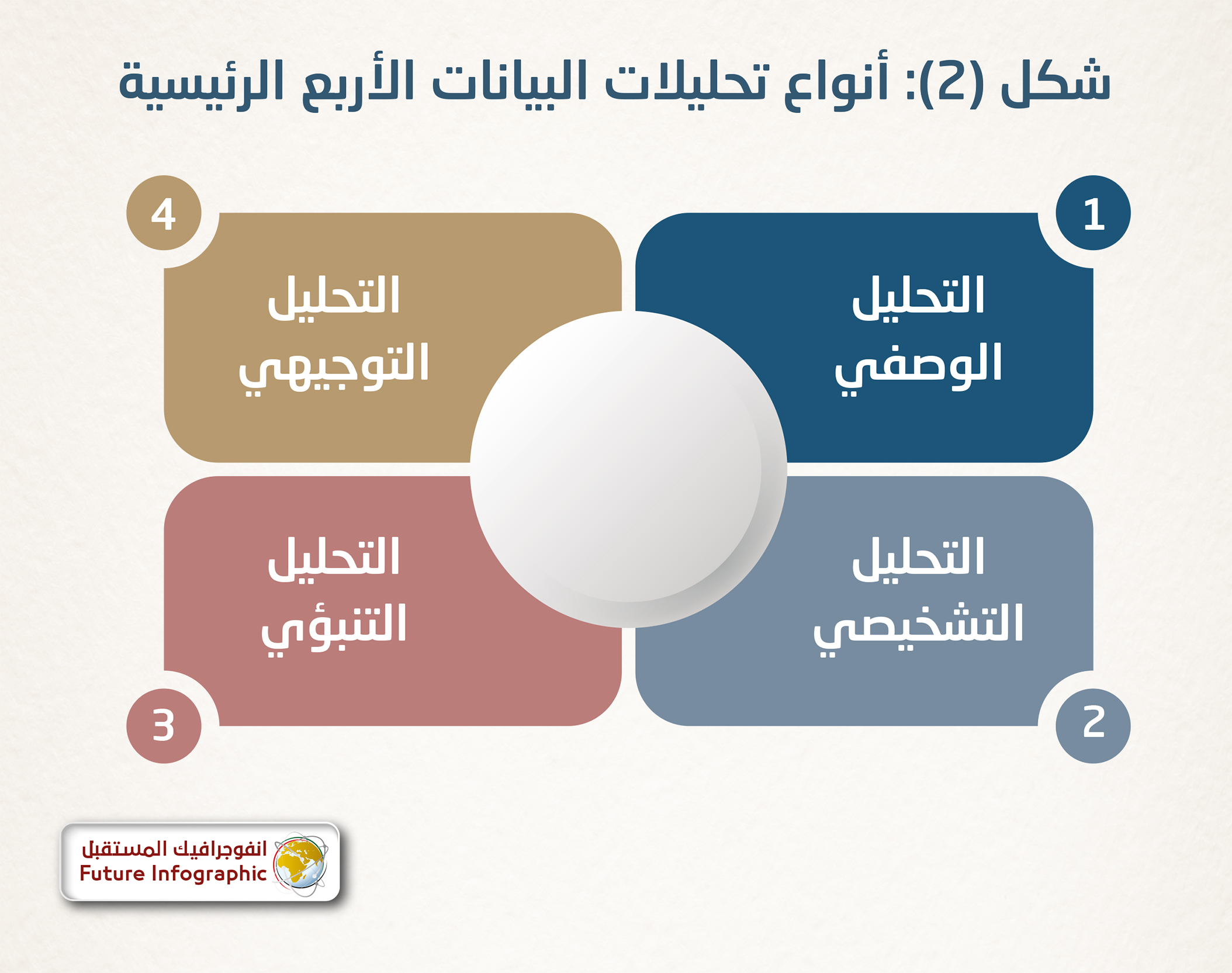 وتنقسم طرق التحليل إلى أربع فئات رئيسية حسب درجة التعقيد: التحليل الوصفي والتحليل التشخيصي والتنبؤي والتوجيهي، وكلما انتقلت من الأبسط إلى الأكثر تعقيداً، تزداد الصعوبة والموارد المطلوبة، وكذلك مستوى المعطيات الناتجة عن عملية التحليل.