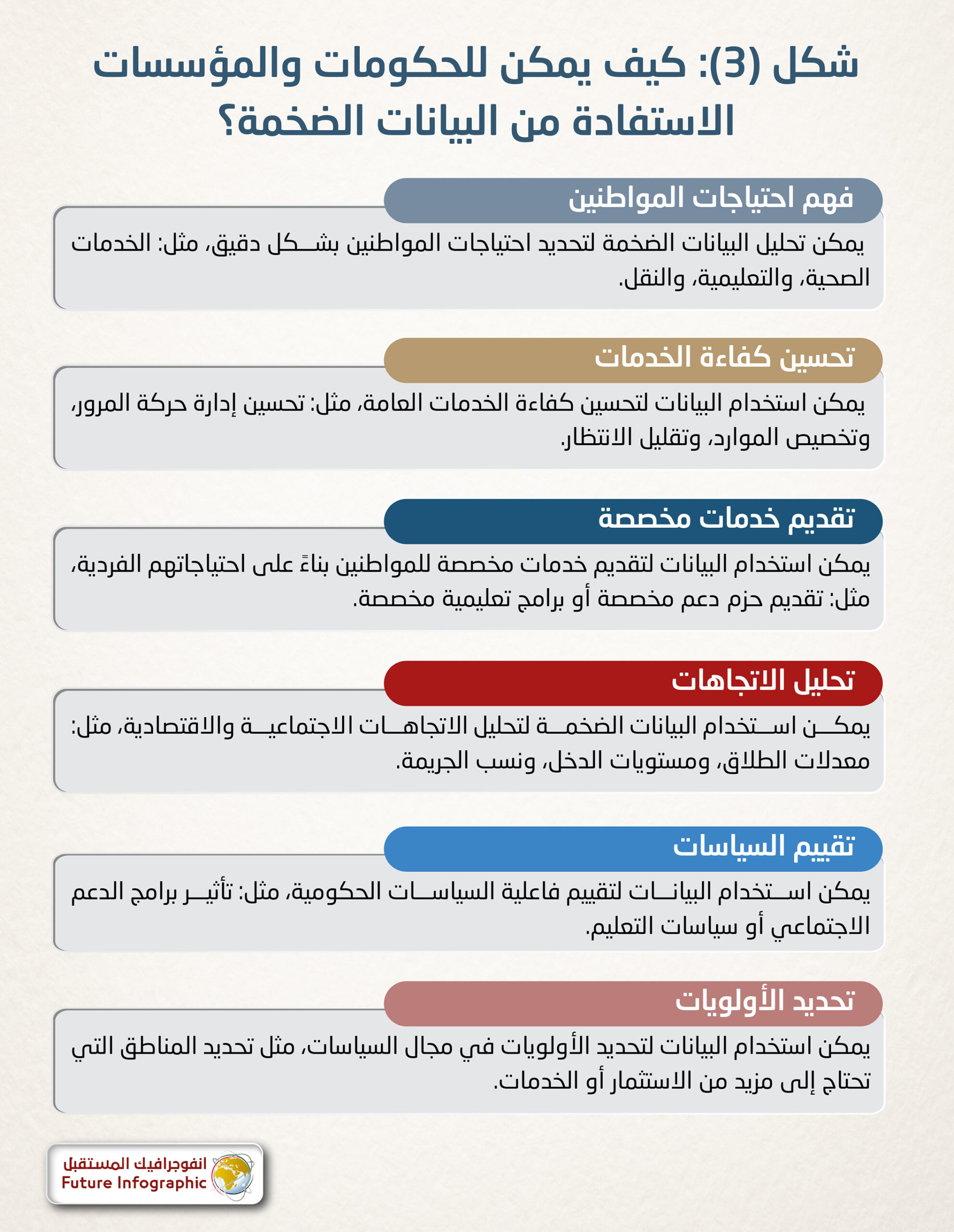 إلى ذلك، يمكن للحكومات والمؤسسات الاستفادة من البيانات الضخمة بشكل كبير؛ لتحسين الخدمات العامة وصنع السياسات الفعالة، وذلك كما يتضح من الشكل التالي: