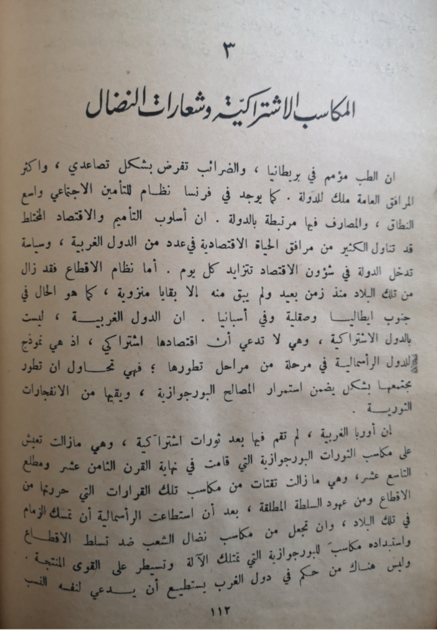 إن مطالب تأميم المرافق العامة والضمان الاجتماعي وزيادة الأجور، كانت منذ سنوات ليست بالبعيدة، مطالب ثورية في الغرب، ينادي بها الاشتراكيون وتناضل من أجلها الطبقة العاملة، ولقد قامت في سبيلها إضرابات وحركات دامية. ولكن البورجوازية استطاعت هناك أن تتمثل بعضاً من هذه المطالب وبشكل تدريجي، بعد أن أُكرِهت عليها من خلال عملية الصراع الطبقي، ومن خلال تنازع المصالح ضمن الظروف الخاصة بتلك الدول الغربية أما الاشتراكيون الثوريون فقد تجاوزوا تلك المطالب المرحلية، إلى مطالب أخرى أبعد وأشمل. والرأسمالية في الغرب، لا تسمي ما تحقق من إصلاحات اقتصادية، بالمنجزات الاشتراكية، وهي لم تعد تفكر يوماً بالتراجع عنها. إنها أشياء تمثلتها البورجوازية ودخلت في طبيعة النظام البورجوازي الغربي، وأصبحت من مقوماته، وبقي الصراع الطبقي مستمراً، وبقيت احتمالات الثورة الاشتراكية قائمة، ولو أن هذا التطور في عقلية البورجوازية الغربية وفي أساليبها، قد اضطر الاشتراكيون الثوريون إلى «مراجعة» أفكارهم، وإلى إعادة النظر في خططهم وتقديراتهم.