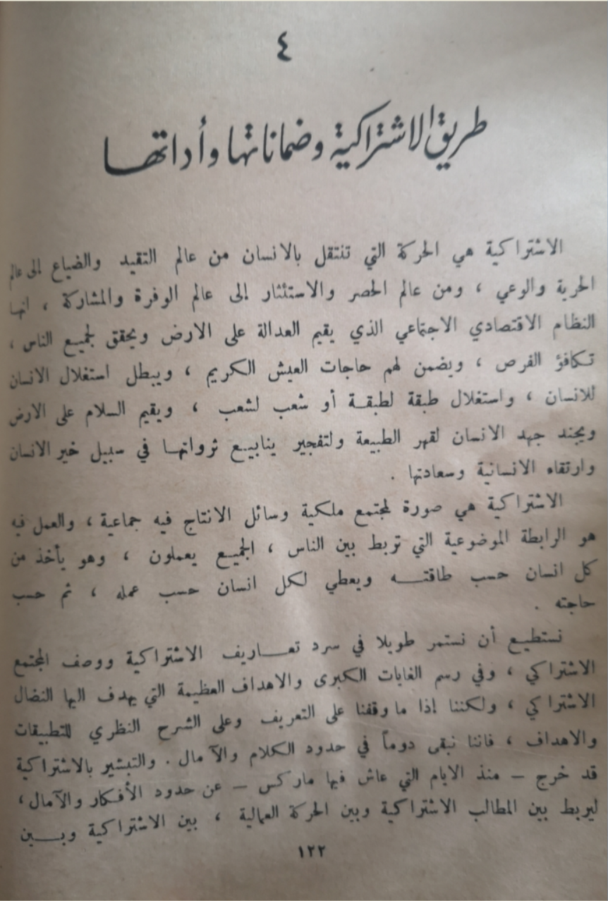 الاشتراكية هي الحركة التي تنتقل بالإنسان من عالم التقيد والضياع إلى عالم الحرية والوعي، ومن عالم الحصر والاستئثار إلى عالم الوفرة والمشاركة، إنها النظام الاقتصادي الاجتماعي الذي يقيم العدالة على الأرض ويحقق لجميع الناس، تكافؤ الفرص، ويضمن لهم حاجات العيش الكريم، ويبطل استغلال الإنسان للإنسان، واستغلال طبقة لطبقة أو شعب لشعب، ويقيم السلام على الأرض ويُجند جهد الإنسان لقهر الطبيعة ولتفجير ينابيع ثرواتها في سبيل خير الإنسان وارتقاء الإنسانية وسعادتها.