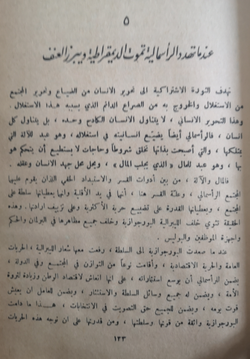 ولكن جماهير الشعب التي تفتَحَ وعيها من خلال الصراع الطبقي، والتي عرفت من معاناتها اليومية ما تقوم عليه الديمقراطية البورجوازية من زيف وتمويه، والتي عرفت كيف تسلطت الرأسمالية على الحكم والبرلمانات، وخبِرَت ما في ليبرالية البورجوازية من استبداد فعلي ومن استئثار ومن تضييع لحرية الإنسان، إن هذه الجماهير نهضت تناضل ضد هذا التزييف، ونهضت تطالب بديمقراطية شعبية وبربط الديمقراطية السياسية بالديمقراطية الاجتماعية، وأخذت تكافح في سبيل إلغاء الاستغلال، وإزالة تسلط الرأسمالية على الحكم وعلى البرلمانات..
