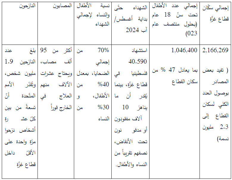 وفي الجدول الآتي بيانات عن التركيب الاجتماعي لسكّان قطاع غزّة ونتائج العدوان على القطاع، كما ورد في التقارير الدولية والفلسطينية: