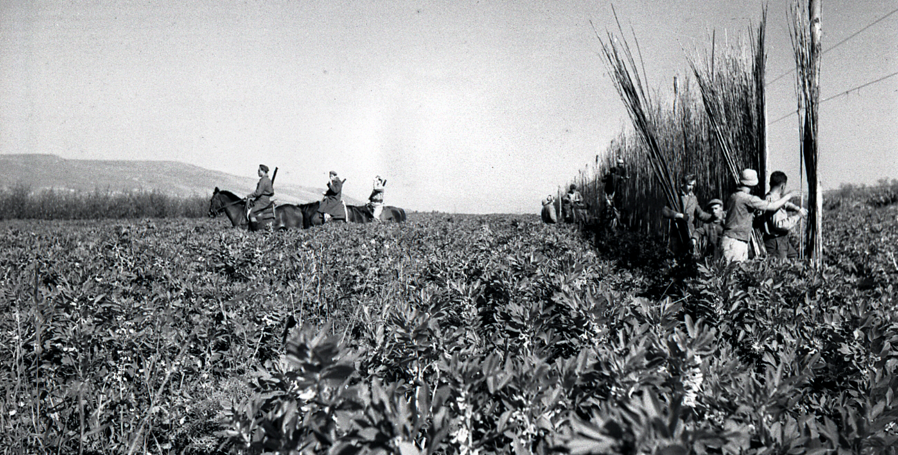{ تُظهر الصورة مشهداً طبيعياً من البيئة الزراعية، حيث يمتد حقلاً واسعاً مغطى بالنباتات. في الخلفية، يمكن رؤية مجموعة من الأشخاص يمتطون الخيول، بينما في المقدمة يقوم بعض العمال بقطع المحاصيل أو جمعها. المشهد يبدو تقليدياً وقديم الطراز، مما يوحي بأنه يُمثل فترة زمنية سابقة في تاريخ الزراعة. الأجواء تعكس العمل الشاق والاتصال المباشر مع الأرض }