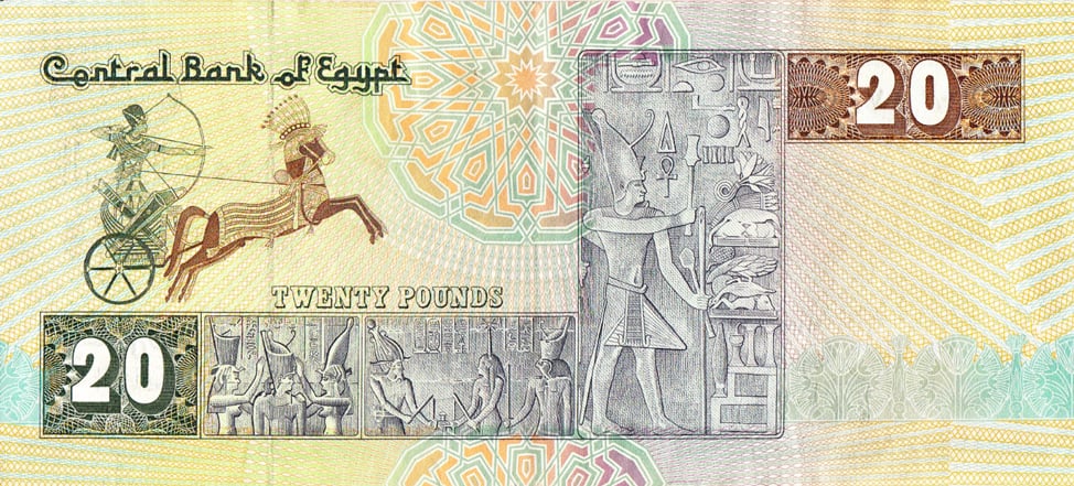 أن الصورة على ورقة العشرين جنيها تنظر في اتجاه عكسي لوضعها الحقيقي في المعبد. لقد ذهب الفنان المصري القديم إلى تصميم رمسيس الثاني على عربته الحربية مندفعاً من الغرب للشرق أي من اليمين إلى اليسار على الجدارية وليس من اليسار إلى اليمين كما يبدو على هذه العملة الورقية.