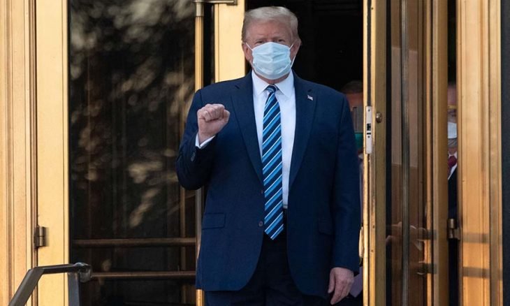 ثم عاد إلى البيت الأبيض حيث ثمة جناح هو بمثابة مستشفى صغير خاص بالرئيس، وخرج على الشرفة ليخلع كمامته رافعاً قبضته وكأنه ملاكم محترف انتصر على خصمه في مباراة حامية، ثم غرّد من جديد مستشهداً بصحافية أسترالية من روّاد الصحافة اليمينية كتبت عنه مقالاً بعنوان «تُظهر معركة فيروس كورونا بسالة الرئيس ترامب» جاء فيه ما غرّد به، وهو «أن الرئيس، لو عاد إلى مزاولة الحملة الانتخابية، سوف يكون بطلاً لا يُقهر [كذا]، وقد تغلّب ليس على كل الحِيَل القذرة التي رماها عليه الديمقراطيون، بل وعلى الفيروس الصيني [كذا] أيضاً. وسوف يُظهر لأمريكا أنه ينبغي ألا نخاف».