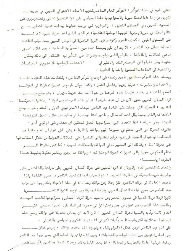وينعقد هـذا المؤتمر بعـد مرور عامين ونصف على اجتماع المؤتمر الخامس، ولقد كانت هذه الفترة حافـلة بالأحـداث والتغيــرات، دوليـاً وعربيـاً وداخل القطـر، ولكننـا مع كل مـا وقـع من تغييــرات ما زلنــا في الموقع العام ذاته الذي يحدد طبيعة هـذه المرحلة من حيـاة أمتنا منذ هزيمة حزيران، وهو موقع عجـز قوى النضال العربي حتى الآن عن أن تجـد طريقهــا لتجـاوز هـذه المرحلة وعن الوفـاء بمتطلبات معركة التحرير، المعـركة التي جعلت منهـا قيادة عبد الناصر الهـدف الاستراتيجي الأول والمُتقـدم على جميع الأهــداف والذي يحيط بكل أهـداف نضال جماهير أمتنـا ليضعهـا في مساره، فمن خلال العمل لبلورة هذا الهدف وعلى طريقه، إنمــا تتحدد اليـوم استراتيجيـة العمـل لتحقيق أي هـدف وطني أو قومي آخــر.