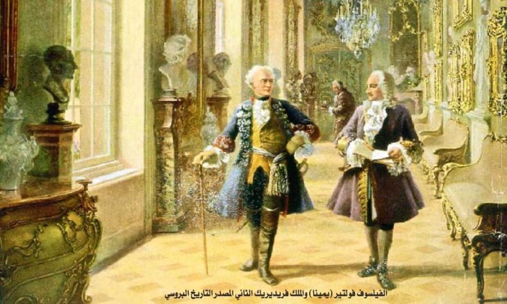 كان فريدريك (1712 ـ 1786) ملك المملكة الألمانية بروسيا، التي كانت عاصمتها مدينة برلين. ولكن شخصيته برزت قبل ذلك، أي عندما كان وليا للعهد، حيث كان شغوفا بالثقافة بشكل عام والثقافة الفرنسية بشكل خاص، وتكلم الفرنسية أفضل من الألمانية، على الرغم من معارضة والده الشديدة حيث اعتبر الثقافة الفرنسية من العلامات غير الرجولية. وحاول فريدريك جاهدا أن يكون فيلسوفا، وسعى جاهدا للحصول على تقدير الطبقة المثقفة له. ولذلك أرسل عام 1736 رسالة إلى فولتير مليئة بالمديح المبالغ به، ما أصاب فولتير بالدهشة والسعادة معا. واستمرت المراسلات بينهما، حيث أخذ فريدريك يرسل كتاباته من مقالات سياسية وأشعار باللغة الفرنسية. وكان فولتير يقوم بتصحيح القواعد اللغوية لهذه الأعمال الأدبية، ويضيف ملاحظات عليها حتى إن أحد أشهر أعمال فريدريك، الذي تكون من ألف وستمئة سطر، كان منها ثلاثمئة سطر من تأليف فولتير. وإذا كان فريدريك يكيل بالمديح لفولتير، فإن الأخير لم يقصر في رد الجميل، إذ أطلق عليه اسم الفيلسوف والأكبر، وقارنه بكبار الفلاسفة والحكماء من الملوك في العصرين الإغريقي والروماني. وعلق فولتير، «إن المثقفين عادة يتملقون للملوك، ولكن فريدريك هو الذي يبدي إعجابه الشديد بي». ولم يكن فريدريك الملك الوحيد الذي تراسل مع فولتير، حيث تبادل الفيلسوف الفرنسي المراسلات مع الامبراطورة الروسية كاترين، التي كانت تكتب إليه وكأنها تلميذته. وكان لفولتير سبب عملي لهذه المراسلات، حيث أن علاقته المتوترة مع الدولة والكنيسة الفرنسيتين تدفعه إلى التفكير باحتمال طلبه للجوء إلى دولة أجنبية.