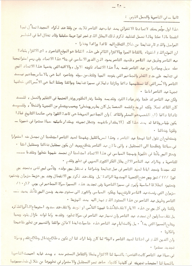 لقد مجدنا ونُمجد أياماً لعبد الناصر في عمل تنظيمنا ونشراتنا، نحتفل بيوم مولده ونأسى ليومٍ قضى، نُمجد يوم ثورة /٢٣/ تموز ويوم صنع التجربة الوحدوية الرائدة بل ونقف عند ذكرى يوم الانفصال وعند يوم هزيمة حزيران ونعتبره انطلاقة أساسية وكبرى في مسيرة الناصرية وفي تجديد هذه المسيرة حركة الجماهير في يومي /٩ و١٠/ حزيـران التي رفعت عبد الناصر فارتفع بها وبفكره السياسي والثوري إلى مستوى جديد، ونحن اليوم نأخذ بعبد الناصر وطريق عبد الناصر من هذا المستوى الذي نهض إليه بعد الهزيمـة.