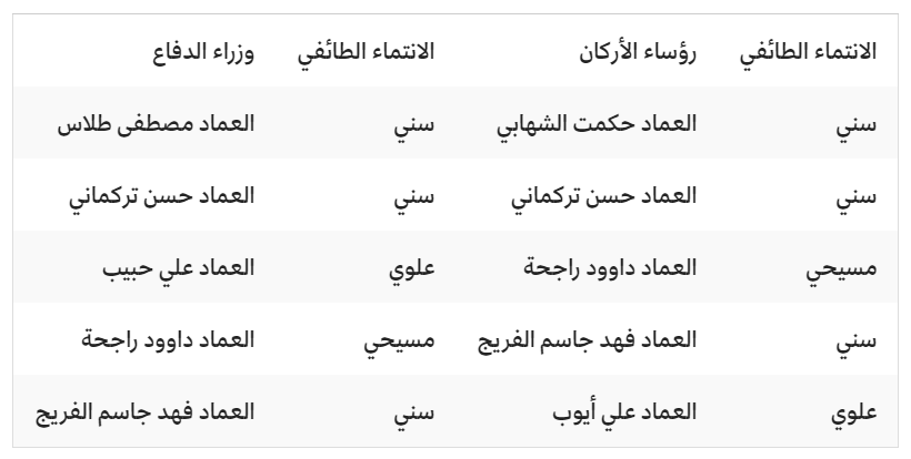 الجدول 1- وزراء الدفاع وقادة الأركان في القوات المسلحة السورية في عهد بشار الأسد (2000-2011) وفق الانتماء الطائفي: