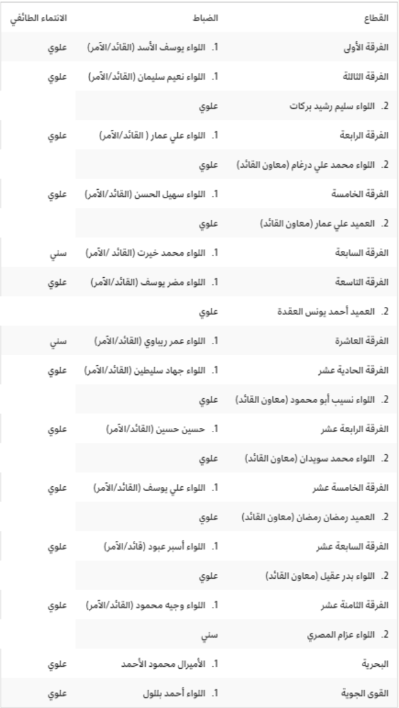 الجدول 2- قادة القوات المسلحة السورية عشية ثورة 2011 وفق الانتماء الطائفي: