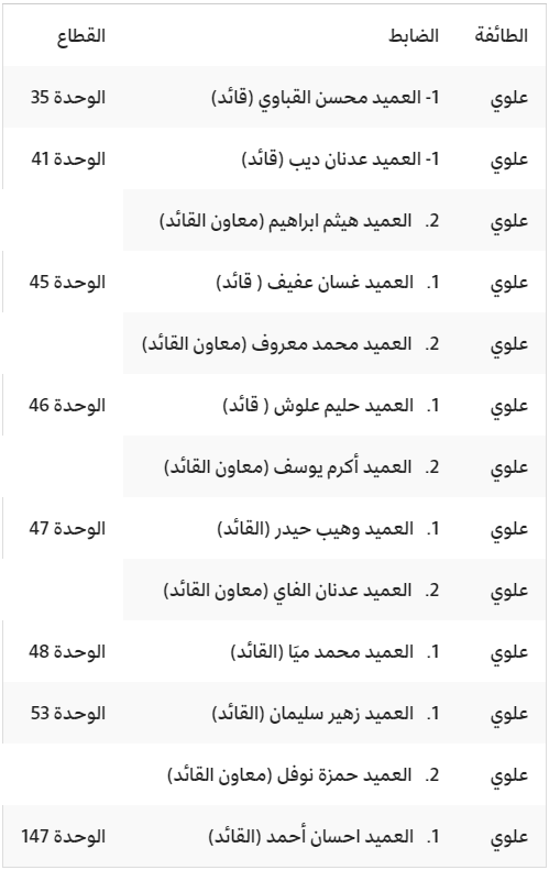 - الشبكة غير الرسمية من بارونات/أسياد الجيش العلوي المحيطة ببشار الأسد، وهم متهمون بالتحيز الطائفي، زيادةً عن مناهضة الضباط السنّة في القوات المسلحة السورية، وتشمل: ماهر الأسد (الفرقة الرابعة المدرعة)؛ آصف شوكت (نائب وزير الدفاع حتى وفاته في عام 2012)؛ الجنرال علي حبيب (القوات الخاصة)؛ اللواء عز الدين إسماعيل (مخابرات القوة الجوية)؛ اللواء جميل حسن (مخابرات القوى الجوية)؛ اللواء رفيق شحادة (الأمن العسكري)؛ اللواء هشام اختيار (مكتب الأمن القومي)، والعميد ذو الهمة شاليش (المخابرات العامة). مقابلة مع عقيد منشقّ (القوّات الخاصة)، 26 أيار/مايو 2014، أنطاكية، تركيا.