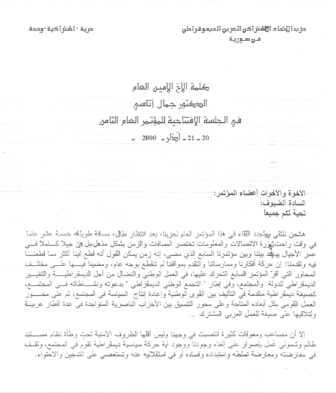 * ألقاها الدكتور جمال الأتاسي بمثل هذا اليوم 20 آذار، قبل عدة أيام من وفاته، رحمهُ الله، بتاريخ 30 آذار 2000