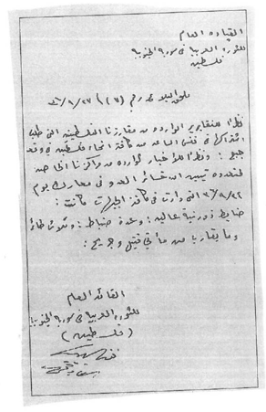 “إن الواجب الوطني والغيرة التي دعتكم لهجر الراحة والوصول إلى هذا الجهاد للذود عن حياض هذا الوطن المقدس، ستدعوكم، ولا شك، لإجابة ندائي هذا الصادر لمصلحة الوطن وللغاية المقدسة نفسها. واقبلوا ختامًا تحيات وإخلاص أخوكم [أخيكم] الواثق بالفوز النهائي”.