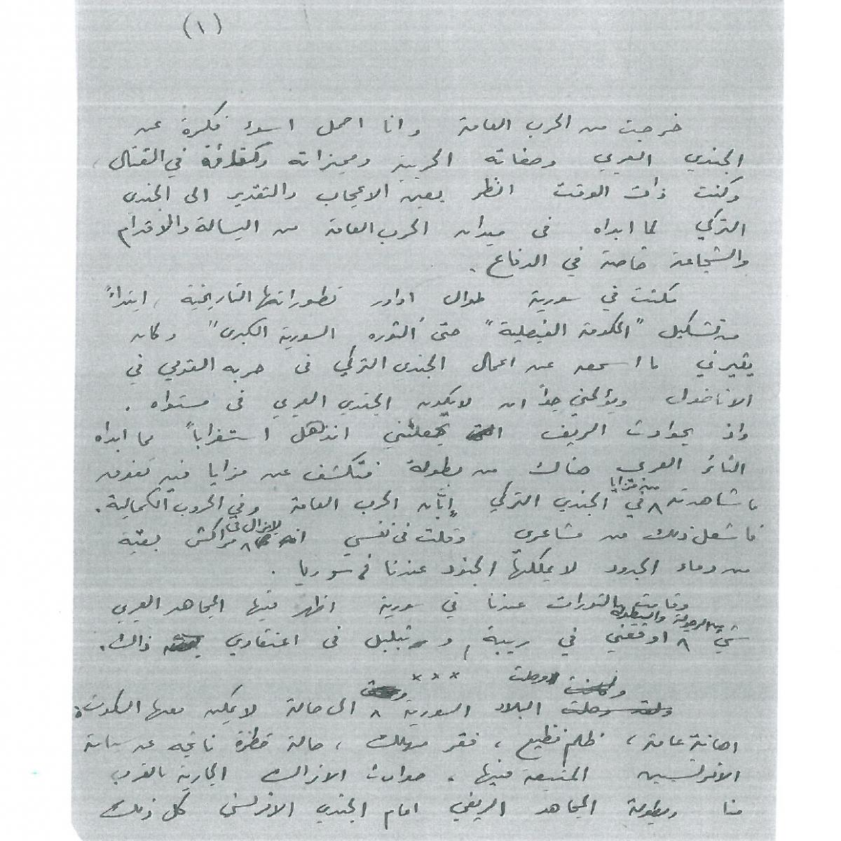 “خرجتُ من الحرب العامة [الحرب العالمية الأولى] وأنا أحمل أسوأ فكرة عن الجندي العربي، وصفاته الحربية، ومميزاته وكفاءته في القتال. وكنتُ [في] ذات الوقت أنظر بعين الإعجاب والتقدير إلى الجندي التركي لما أبداه في ميدان الحرب العامة من البسالة والإقدام والشجاعة خاصة في الدفاع”.