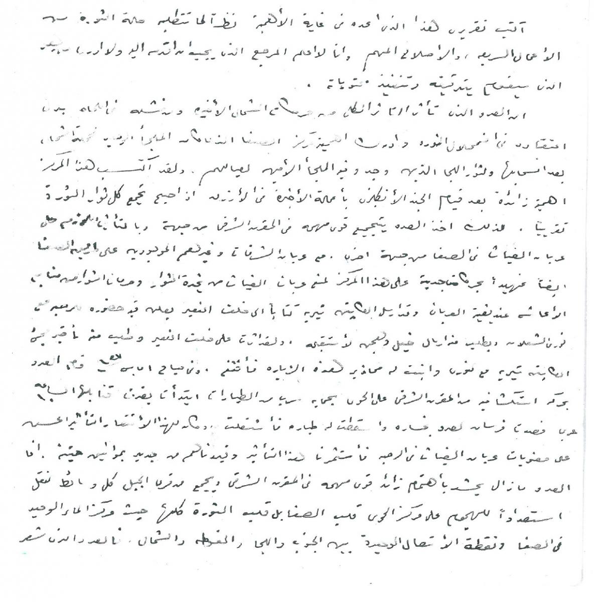 1- إن العدو الذي سحب ثلثي جنوده إلى الشمال على أثر حركتنا فيه، لم يتمكن من الانتصار في معارك اللجاة أوائل الشهر الماضي، ولكنه أعاد الكرّة ثانية على أثر انسحابنا من الشمال، فانسحب قسم من مجاهدي اللجاة إلى الصفا مع عيالهم، وما لبث أن عاد أكثرهم إلى اللجاة، فأخفق العدو هذه المرة أيضًا، ولم يتمكن من تنفيذ مأربه، وحالته الآن جيدة جدًا.
