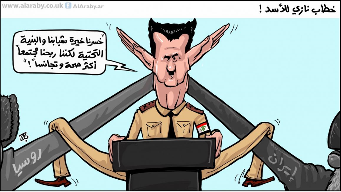 اليوم، يشهد التاريخ ولادة هتلرية جديدة في العالم المعاصر، إذ لم يعد العالم يهتز لرؤية حاكمٍ مستبدٍ، قتل نصف الشعب السوري، ودمّره وشرّده وأخفى مصيره، وأعاد البلد إلى عصر ما قبل المدنية، وما قبل المجتمع، وارتكب أفظع الجرائم والانتهاكات غير الإنسانية لكل ما هو بشري في الأرض السورية سبع سنوات، يردّد خطاباً محشواً بأفكار نازية، اعتقدنا أنها بادت.
